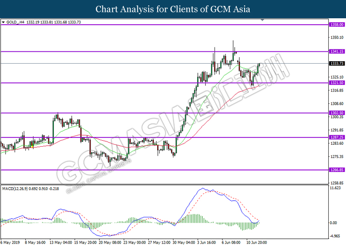 GOLD_, H4: Gold price was trade higher following prior rebound from the support level 1321.50. MACD which illustrate bias bullish momentum and the starting formation of golden cross suggest gold to extend its gains towards the resistance level 1339.10.