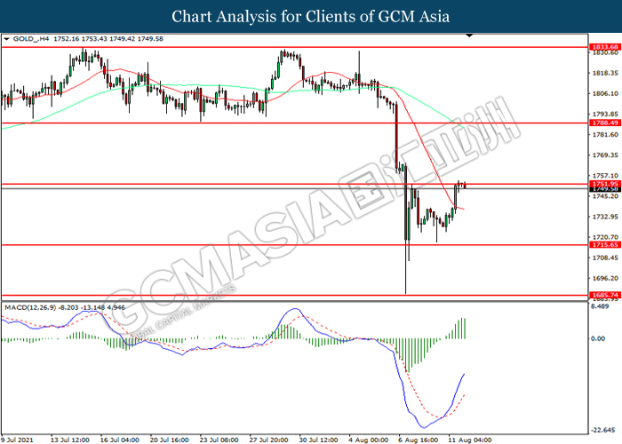 GOLD_, H4: Gold price was traded higher while currently testing the resistance level at 1751.95. MACD which illustrated increasing bullish momentum suggest the commodity to extend its gains after it successfully breakout above the resistance level.