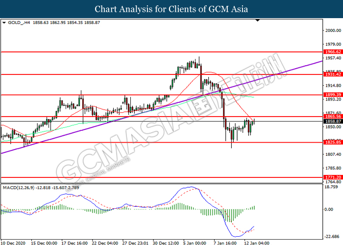 GOLD_, H4: Gold price was traded higher while currently testing the resistance level at 1865.55. MACD which illustrated increasing bullish momentum suggest the commodity to extend its gains after it successfully breakout above the resistance level.
