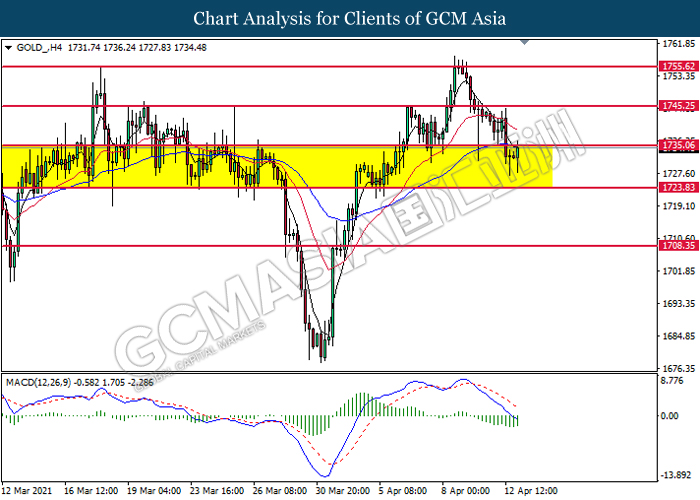 GOLD_, H4: Gold price was traded higher while currently testing the resistance level at 1735.05. However, MACD which illustrated bearish bias momentum signal suggest the commodity to undergo technical correction in short term.