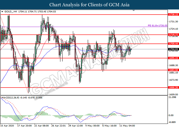 GOLD_, H4: Gold price was traded higher following prior rebound from the support level at 1695.15. MACD which illustrate diminishing bearish momentum signal suggest the commodity to extend its gains toward the resistance level at 1709.45.