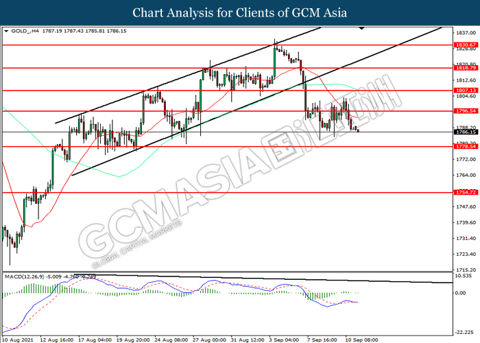 GOLD_, H4: Gold price was traded lower while currently near the support level ta 1778.55. MACD which illustrated increasing bearish momentum suggest the commodity to extend its losses after it successfully breakout below the support level.