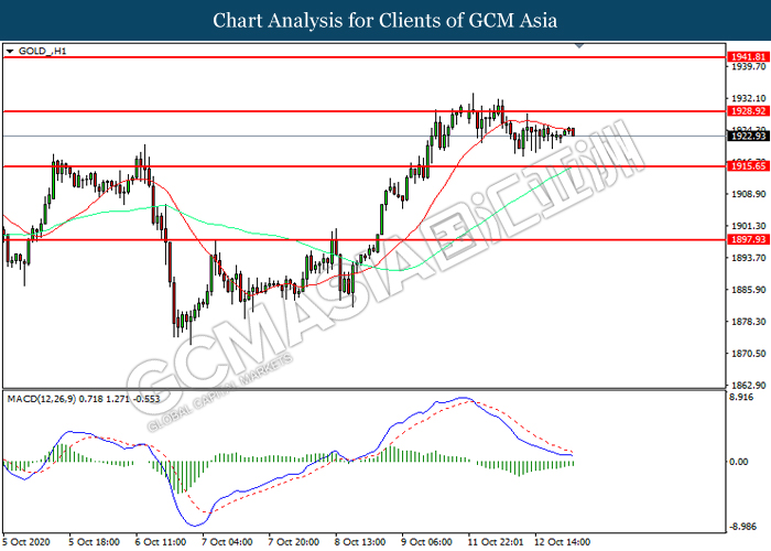 GOLD_, H1: Gold price was traded lower following prior retracement from the resistance level at 1928.90. However, MACD which illustrated diminishing bearish momentum suggest the commodity to be traded higher in short-term as technical correction.