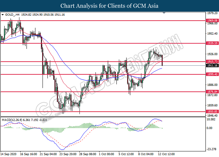 GOLD_, H4: Gold price was traded lower following prior breakout below the previous support level at 1915.75. MACD which illustrate bearish momentum with the formation of death cross suggest the commodity to extend its losses toward the support level at 1899.40.