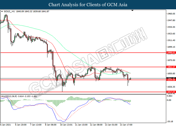GOLD_, H1: Gold price was traded lower while currently testing the support level at 1839.10. However, MACD which illustrated diminishing bearish momentum suggest the commodity to be traded higher in short-term as technical correction.