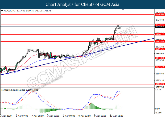GOLD_, H1: Gold price was traded higher while currently testing the resistance level at 1722.15. However, MACD which illustrate diminishing bullish momentum suggest the pair to undergo technical correction in short term toward the support level at 1700.15.