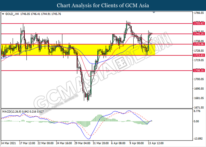 GOLD_, H4: Gold price was traded higher while currently testing the resistance level at 1745.25. MACD which illustrated bullish momentum signal suggest the commodity to extend its gains after it successfully breakout above the resistance level.
