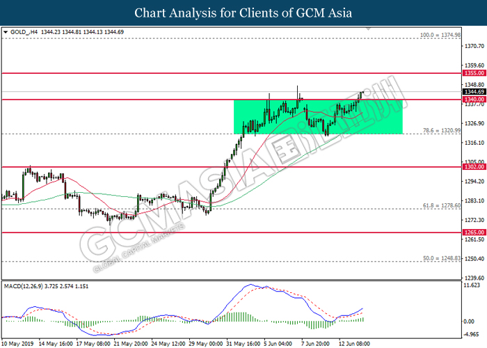 GOLD_, H4: Gold price was traded higher after closing above the resistance of 1340.00. MACD which illustrate bullish signal suggests its prices to advance further up, towards the direction of 1355.00.