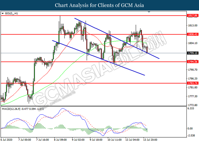 GOLD_, H1: Gold price was traded lower following prior retracement from the resistance level at 1808.45. MACD which illustrated increasing bearish momentum suggest the commodity to extend its losses toward support level at 1794.55.
