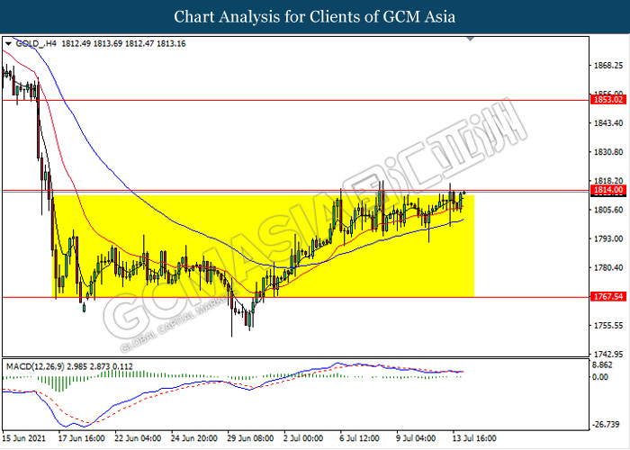 GOLD_, H4: Gold price remain traded in a sideway channel while currently testing the resistance level 1814.00. However, MACD which illustrate bearish bias signal suggest the commodity to be traded lower in short term towards the support level 1767.55.