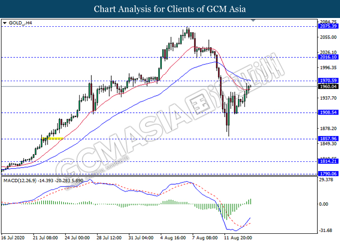 GOLD_, H4: Gold price was traded higher while currently testing near the resistance level 1970.60. MACD which illustrate bullish momentum signal with the formation of golden cross suggest the commodity to extend its gains after it breaks above the resistance level.