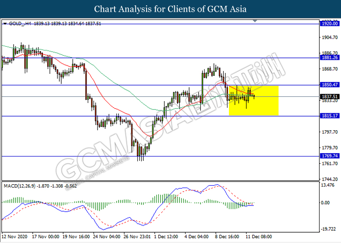 GOLD_, H4: Gold price remain traded flat in a sideway channel. However, MACD which illustrate diminishing bullish momentum suggest the commodity to be traded higher towards the resistance level 1850.45.