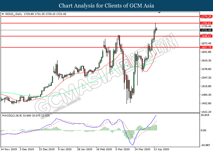 GOLD_, Daily: Gold price was traded higher while currently testing the resistance level at 1745.60. However, MACD which illustrated diminishing bullish momentum suggest the commodity to be traded lower in short-term as technical correction.