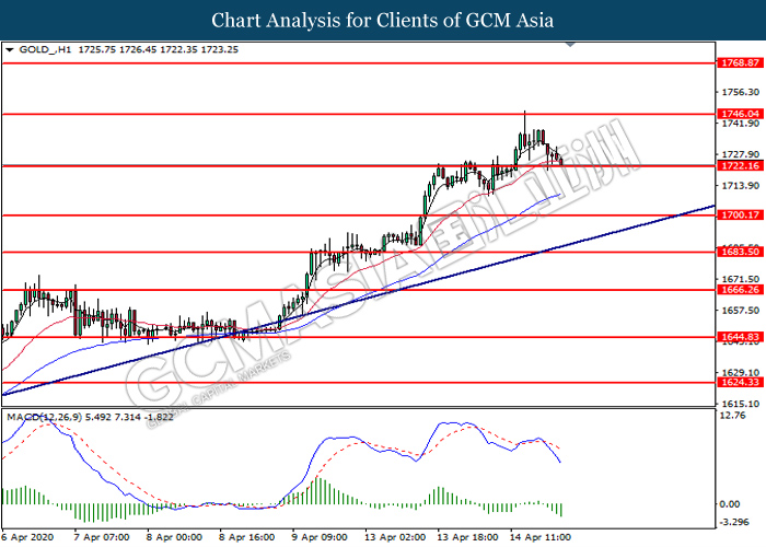 GOLD_, H1: Gold price was traded lower while currently testing the support level at 1722.15. MACD which illustrate bearish bias momentum suggest the pair to extend its losses after it successfully breakout below the support level at 1722.15.