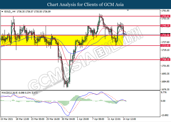 GOLD_, H4: Gold price was traded lower while currently testing the support level at 1735.05. MACD which illustrated bearish momentum signal suggest the commodity to extend its losses after it successfully breakout below the support level.