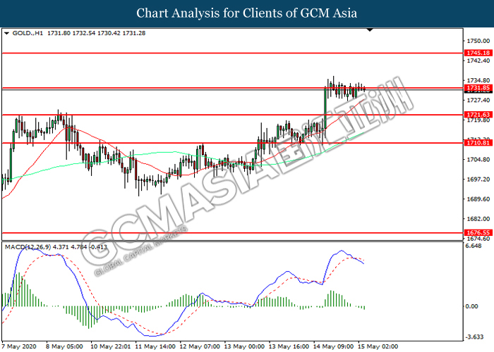GOLD_, H1: Gold price traded within a range while currently testing the resistance level at 1731.85. However, MACD which illustrate increasing bearish momentum suggest the commodity to be traded lower in short-term as technical correction.