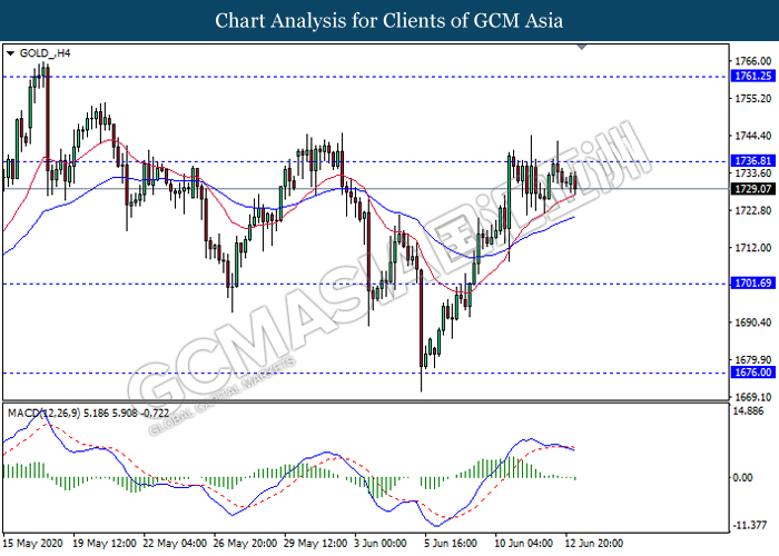GOLD_, H4: Gold price was traded lower following prior retracement from the resistance level 1736.80. MACD which illustrate bearish momentum signal with the formation of death cross suggest the pair to extend its retracement towards the support level 1701.70.
