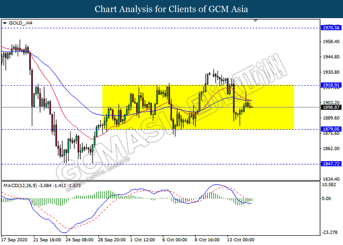 GOLD_, H4: Gold price remain traded in a sideway channel. However, MACD which illustrate diminishing bearish momentum signal suggest the commodity to be traded higher in short term towards the resistance level 1918.90
