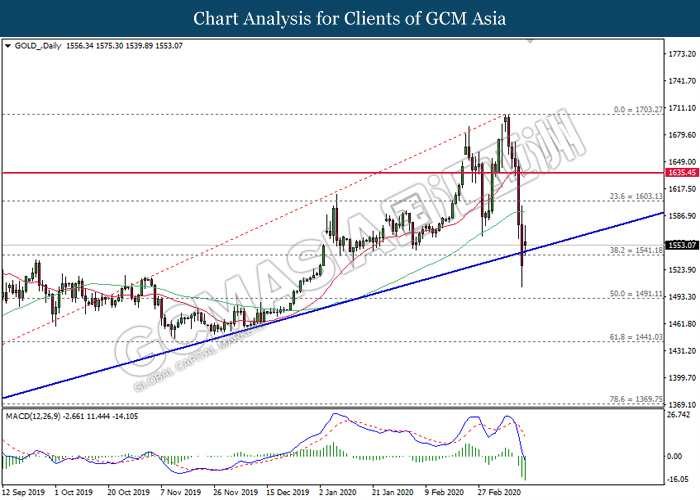 GOLD_, Daily: Gold price was traded lower following prior retrace from the higher levels. MACD which illustrate bearish signal suggests its price to extend its losses after breaking the support at 1541.20.
