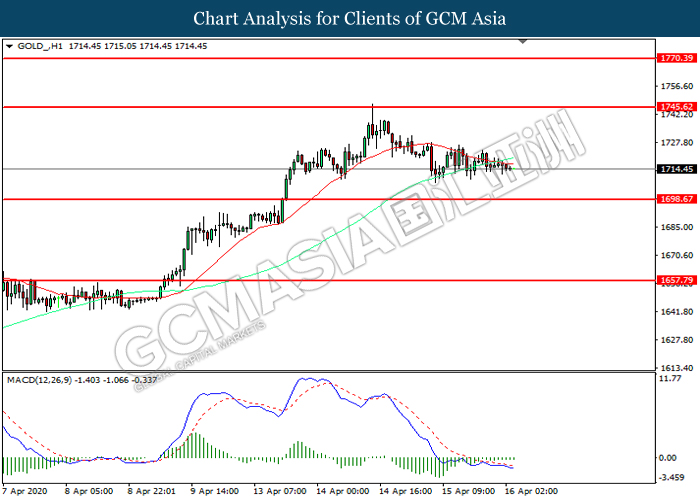 GOLD_, H1: Gold price was traded lower following prior retracement from the resistance level at 1745.60. However, MACD which illustrated diminishing bearish momentum suggest the commodity to be traded higher in short-term as technical correction.