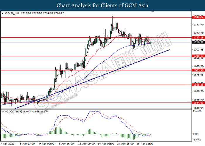GOLD_, H1: Gold price was traded lower while currently testing the 50 moving average line (Blue). MACD which illustrate diminishing bearish momentum suggest the pair to extend its gains toward the resistance level at 1722.15.