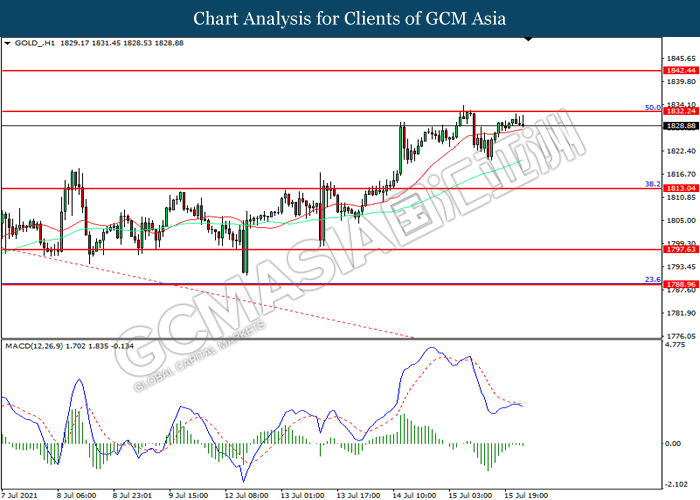 GOLD_, H1: Gold price was traded higher while currently testing the resistance level at 1832.25. However, MACD which illustrated increasing bearish momentum suggest the commodity to be traded lower in short-term as technical correction.