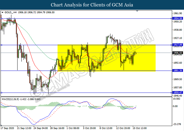 GOLD_, H4: Gold price remain traded in a sideway channel. However, MACD which illustrate bullish bias signal with the formation of golden cross suggest the commodity to be traded higher in short term towards the resistance level 1917.50.