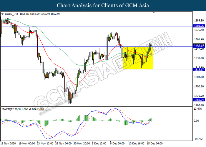 GOLD_, H4: Gold price remain traded in a sideway channel while currently testing the resistance level 1850.45. However, MACD which illustrate bullish momentum signal suggest the commodity to be traded higher after it breaks above the resistance level.