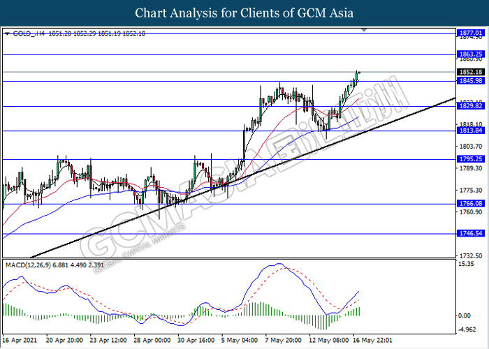 GOLD_, H4: Gold price was traded higher following prior breakout above the previous resistance level 1846.00. MACD which illustrate bullish bias signal suggest the commodity to extend its gains towards the resistance level 1863.25.