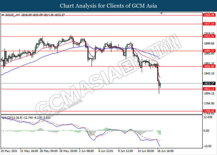 GOLD_, H4: Gold price was traded lower while currently testing near the support level 1812.10. MACD which illustrate bearish momentum signal suggest the commodity to extend its losses after it breaks below the support level.