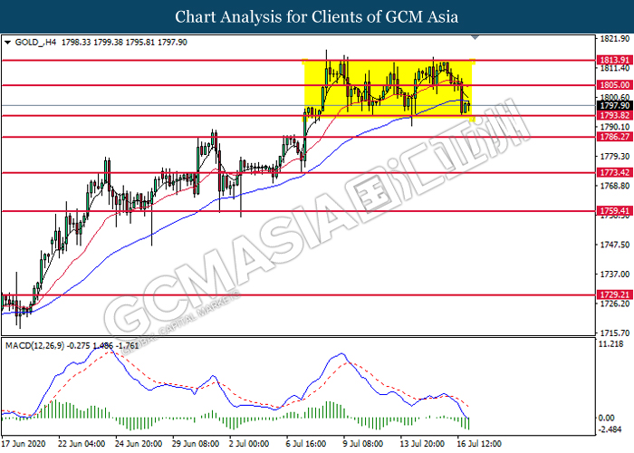 GOLD_, H4: Gold price was traded higher following prior rebound from the support level at 1793.80. MACD which illustrate bearish bias momentum signal suggest the pair to undergo technical correction toward the support level at 1793.80.