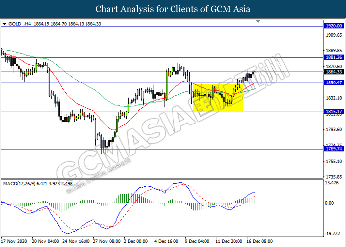 GOLD_, H4: Gold price was traded higher following prior breakout above the previous resistance level 1850.45. MACD which illustrate ongoing bullish momentum signal suggest the commodity to extend its gains towards the resistance level 1881.25.