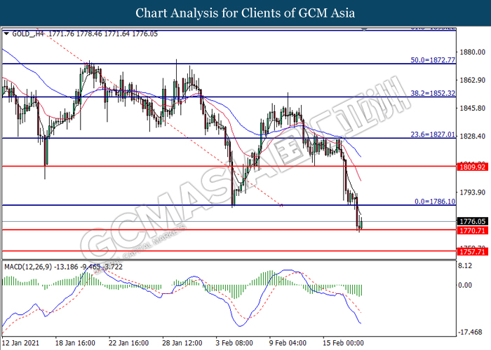 GOLD_, H4: Gold price was traded higher following prior rebound from the support level at 1770.70. MACD which illustrated diminishing bearish momentum suggest the commodity to extend its gains toward the resistance level at 1786.10.