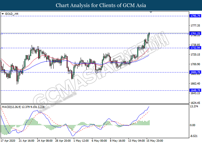GOLD_, H4: Gold price was traded higher while currently testing the resistance level 1761.25. MACD which illustrate persistent bullish momentum signal suggest the commodity to extend its gains after it breaks above the resistance level.
