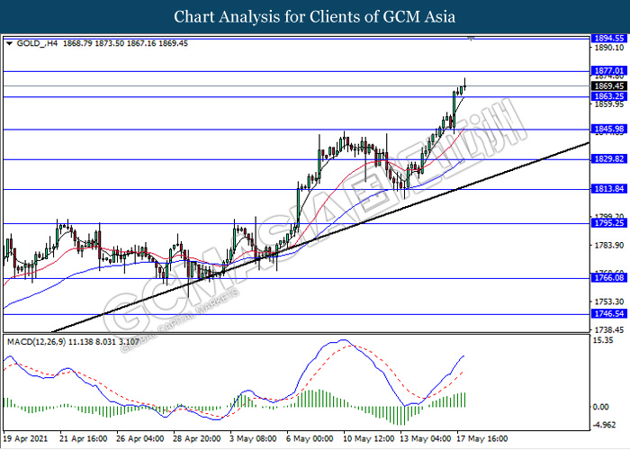 GOLD_, H4: Gold price was traded higher following recent breakout above the previous resistance level 1863.25. MACD which illustrate persistent bullish momentum signal suggest the commodity to extend its gains towards the resistance level 1877.00.