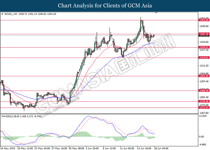 GOLD_, H4: Gold price was traded higher while currently testing near the resistance level 1342.15. MACD which illustrate diminishing bearish momentum suggest gold to extend its gains after successfully breakout above the resistance level at 1342.15.