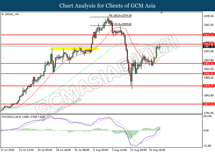 GOLD_, H4: Gold price was traded higher while currently testing the resistance level at 1993.85. MACD which illustrated increasing bullish momentum suggest the commodity to extend its gains after it successfully breakout above the resistance level.