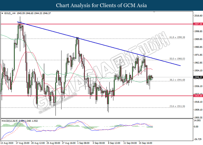 GOLD_, H4: Gold price was traded higher following prior rebound from the lower level. MACD which illustrate diminished downward momentum suggests its price to be traded higher in short-term.
