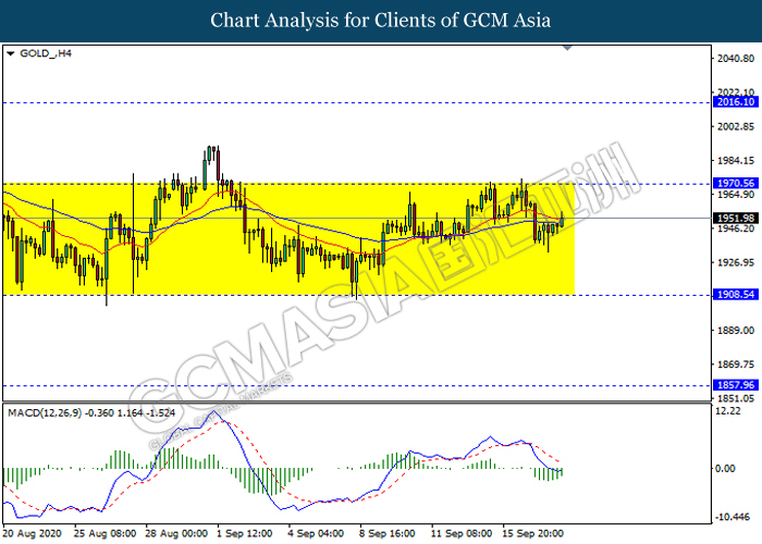 GOLD_, H4: Gold price remain traded in a sideway channel. However, MACD which illustrate bullish momentum signal suggest the commodity to be traded higher towards the resistance level 1970.55.