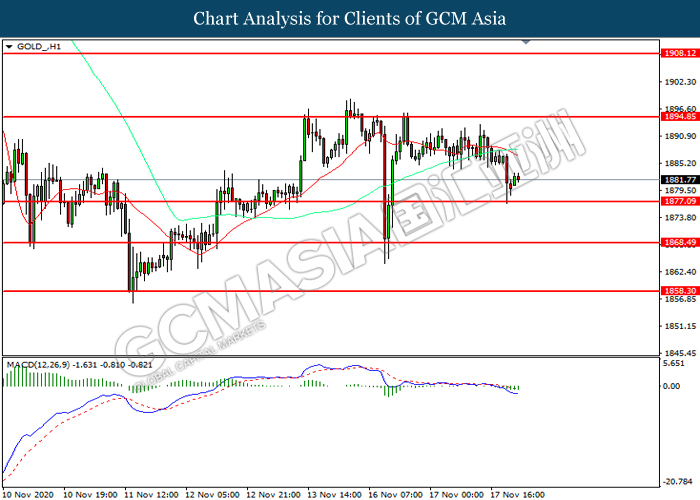 GOLD_, H1: Gold price was traded higher following prior rebound from the support level at 1877.10. MACD which illustrated diminishing bearish momentum suggest the commodity to extend its gains toward resistance level at 1894.85.