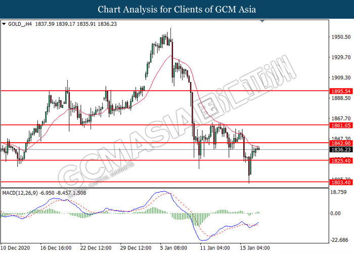 GOLD_, H4: Gold price was traded higher following prior breakout above the previous resistance level at 1825.40. MACD which illustrated bullish bias momentum suggest the commodity to extend its gains toward the resistance level at 1842.90.