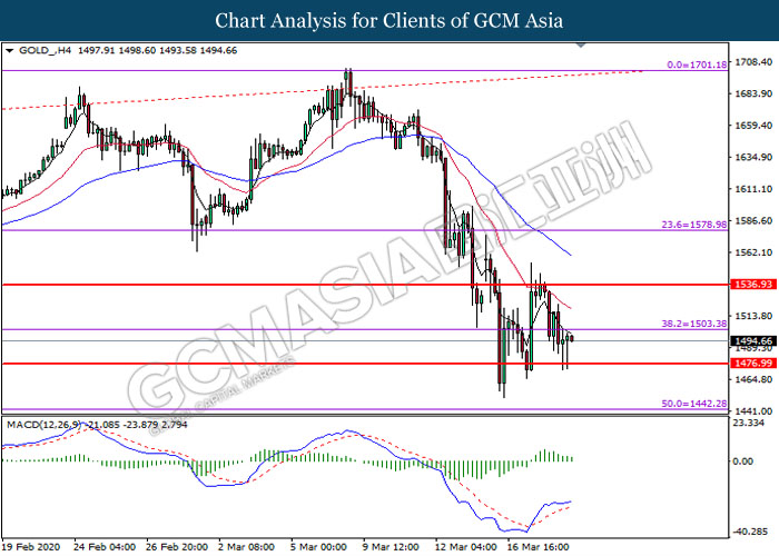 GOLD_, H4: Gold price was traded lower following prior retracement from resistance level 1503.40 MACD which illustrate diminishing bullish momentum signal suggest the commodity to extend its losses toward the support level at 1477.00.