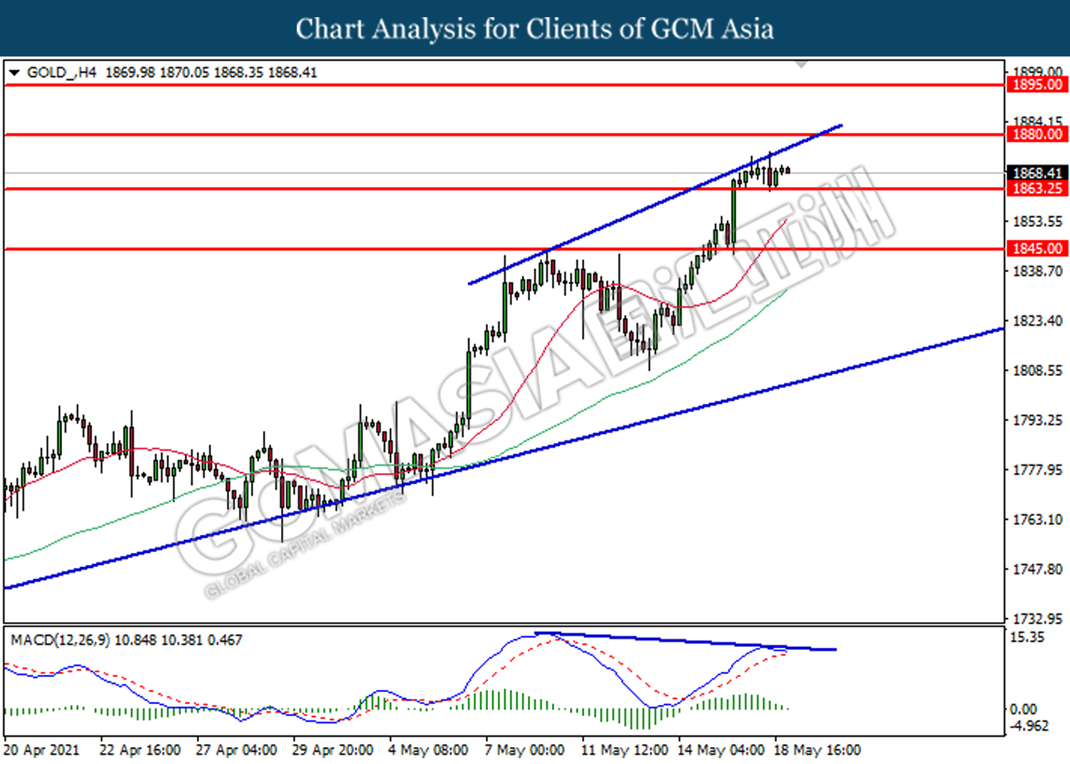 GOLD_, H4: Gold price was traded higher following prior breakout at the resistance level of 1863.25. However, MACD which illustrate bearish divergence signal suggests its price to be traded lower in short-term.