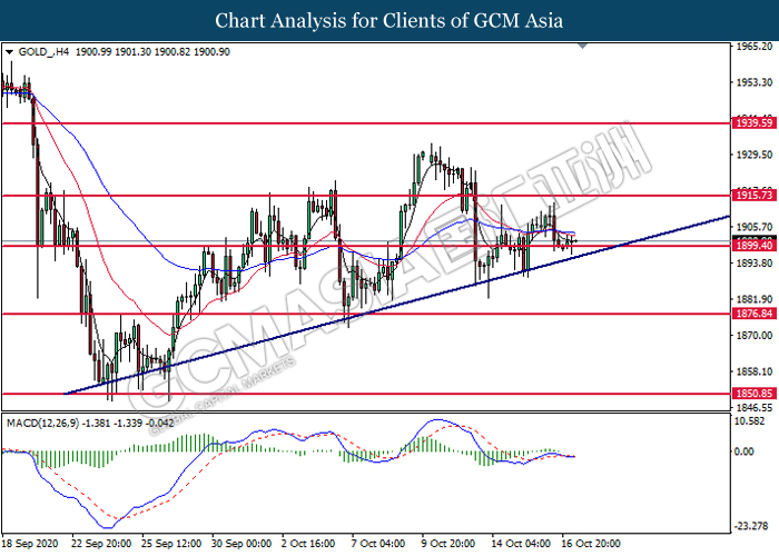 GOLD_, H4: Gold price was traded higher following prior rebound from the support level at 1899.40. Due to lack of signal from the MACD, it is suggested to wait for further confirmation before entering the market.