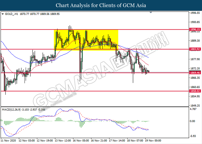 GOLD_, H1: Gold price was traded lower while currently testing the support level at 1869.45. Due to lack of signal from MACD, it is suggested to wait for further confirmation such as breakout below before entering into the market.