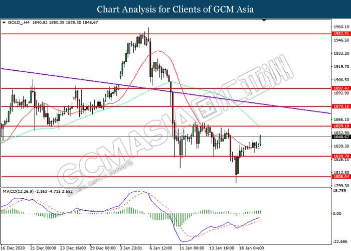 GOLD_, H4: Gold price was traded higher following prior breakout above the previous resistance level at 1828.80. MACD which illustrated increasing bullish momentum suggest the commodity to extend its gains toward resistance level at 1859.10.