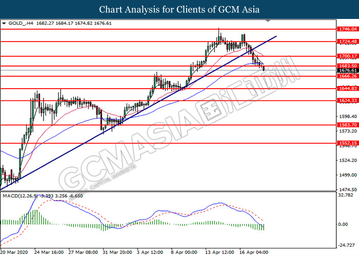 GOLD_, H4: Gold price was traded lower following prior breakout below the previous support level at 1683.50. MACD which illustrate bearish bias momentum suggest the pair to extend its losses toward the support level at 1666.25.