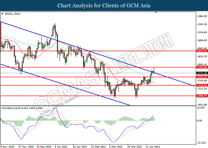 GOLD_, Daily: Gold price was traded higher while currently testing the resistance level at 1791.80 However, MACD which illustrated diminishing bullish momentum suggest the commodity to be traded lower in short-term as technical correction.