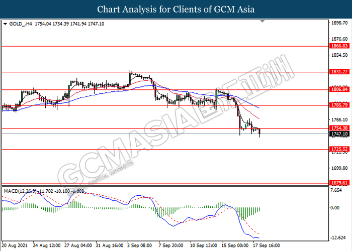 GOLD, H4: Gold price was traded lower following prior breakout below the previous support level 1754.40. MACD which illustrate ongoing bearish momentum signal suggest the commodity to extend its losses towards the support level 1725.50