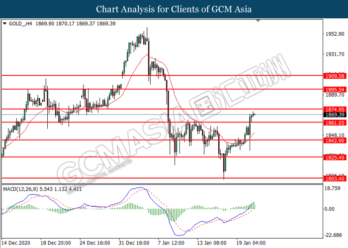 GOLD_, H4: Gold price was traded higher following prior breakout above the previous resistance level at 1861.05. MACD which illustrated bullish bias momentum suggest the commodity to extend its gains toward the resistance level at 1874.95.